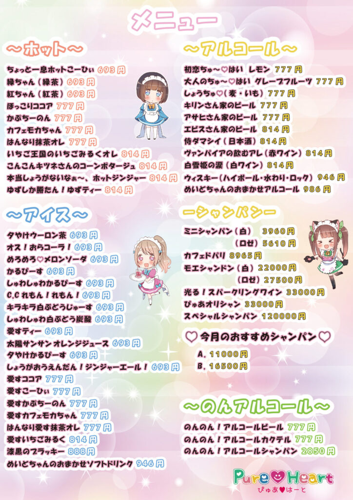 しかもコンカフェとして考えるなら非常に珍しい点としてショット系のメニューが一切存在しません。コンカフェで定番の高額ボトルともいえるエンジェルやフィリコが一切メニュー表に記載されていない点も非常に珍しいです。
